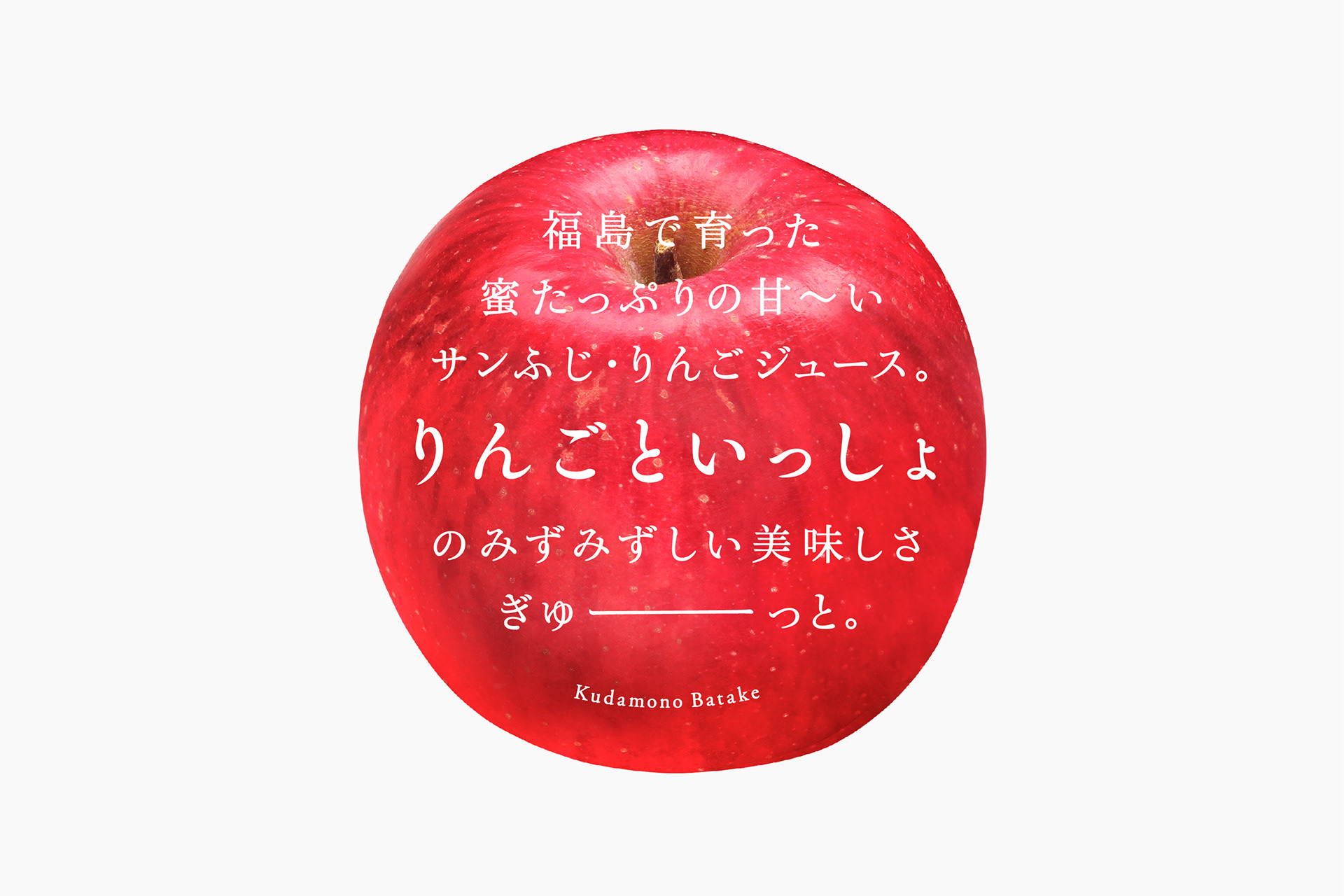素材の良さがまさに“りんごそのもの”であること、そして日々の暮らしにそっと寄り添う存在であることを込めて、「りんごといっしょ」という商品名を名付けました。箱とボトルが一体になったパッケージは、枝に見立てた瓶の口部に一枚の葉っぱをくっ付けた一玉のりんごをイメージしています。球体のボトルにりんごの皮を模したラベルを巻きつけることで、箱から取り出したときの楽しい驚きと、むきたてりんごを丸ごとかじったようなみずみずしい美味しさを感じさせるデザインです。