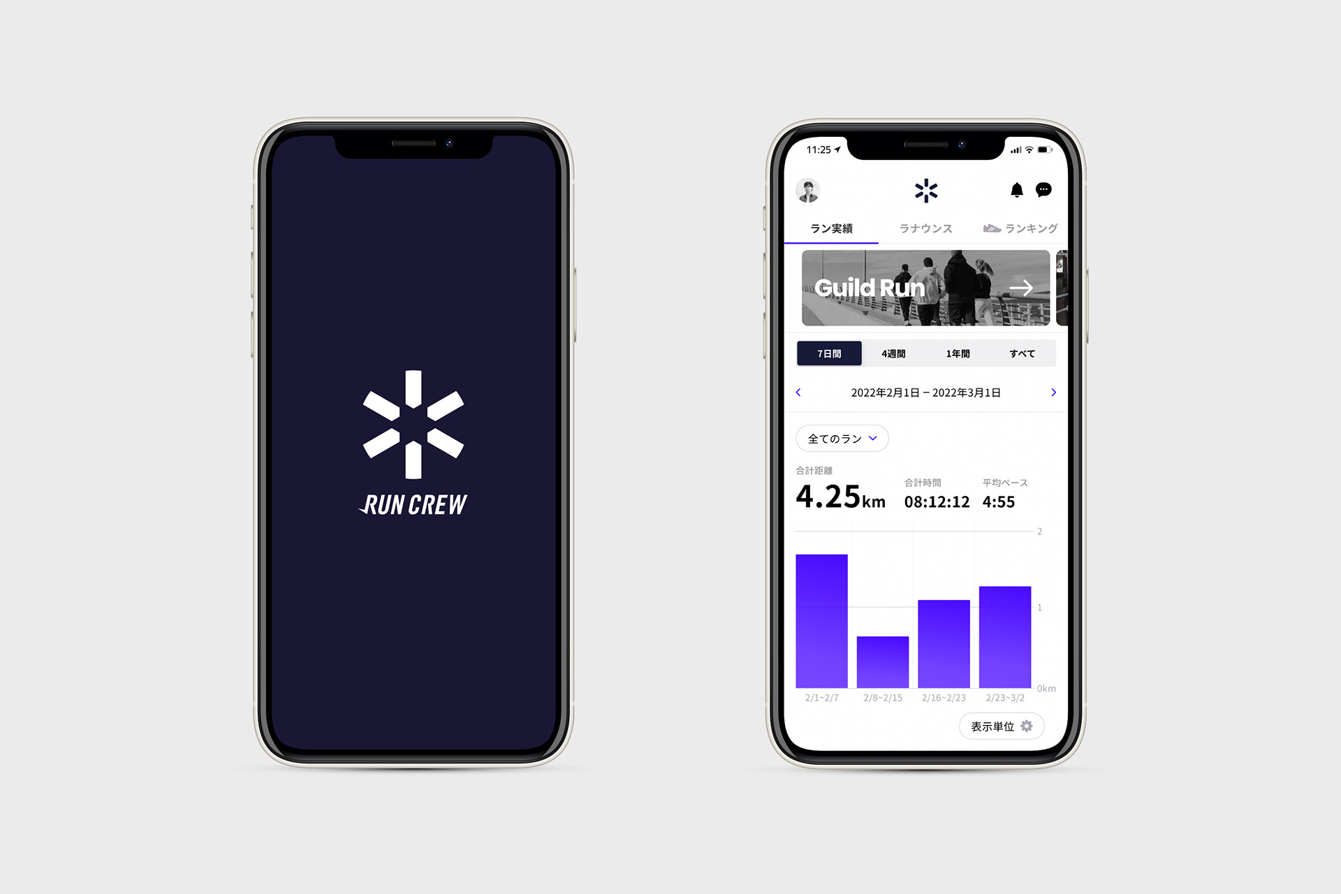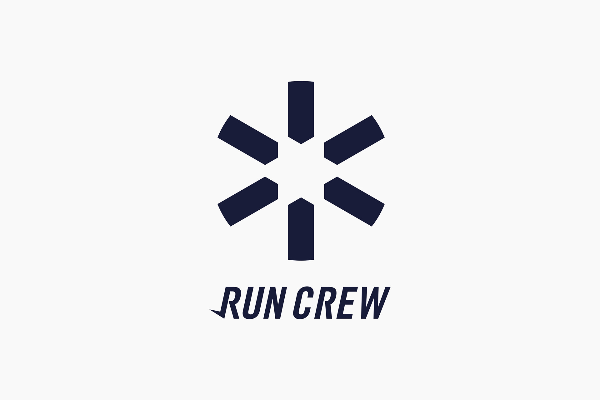 チーム対抗型ランニングアプリ「Run Crew」のロゴマークは、乗算を表す記号「アスタリスク」をモチーフにしています。乗算=チームの力を掛け合わせるという意味合いに加え、アスタリスクの語源である「小さな星」にも着目。中央のネガティブスペースに隠れた星へと向かう矢印の造形によって、仲間とともに目標へ向かって走る姿を象徴しています。チームで円陣を組んだ際の手の重なりや、6週間ごとに開催されるイベントサイクルなど、サービスの特徴を内包する記号として機能しています。