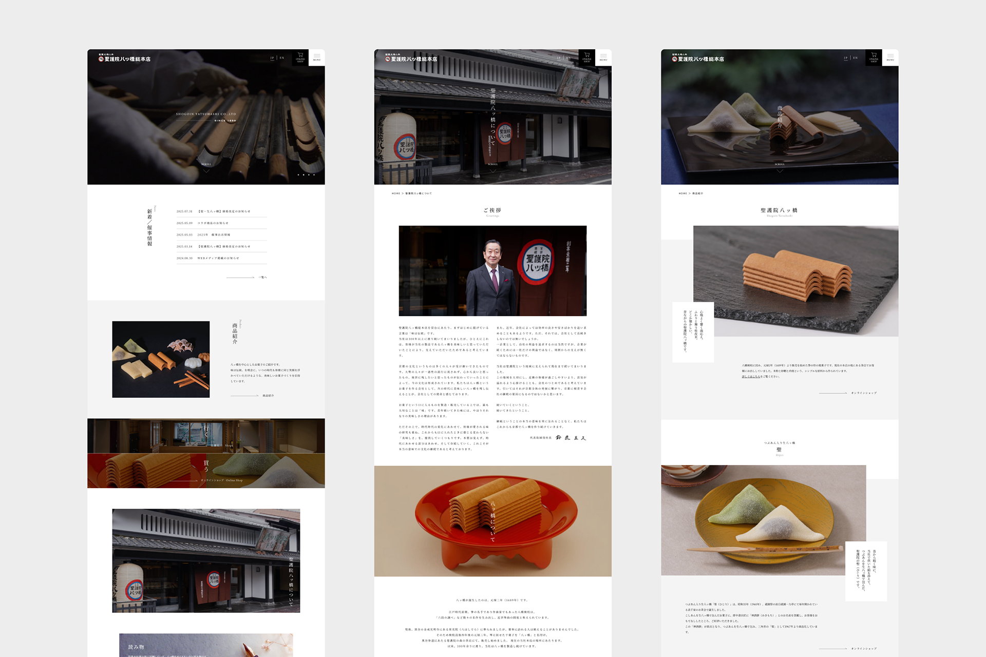 創業1689年。330年以上に渡り、八ッ橋を製造し続けている京都の老舗菓子メーカー聖護院八ッ橋総本店のコーポレイトサイト。今の時代にフィットさせながらも、積み上げてきた歴史と伝統を重んじ、情緒的な佇まいをサイトデザインへと落とし込みました。若い世代からご年配まで、幅広い世代に受け入れられる明瞭なサイトを目指しています。
