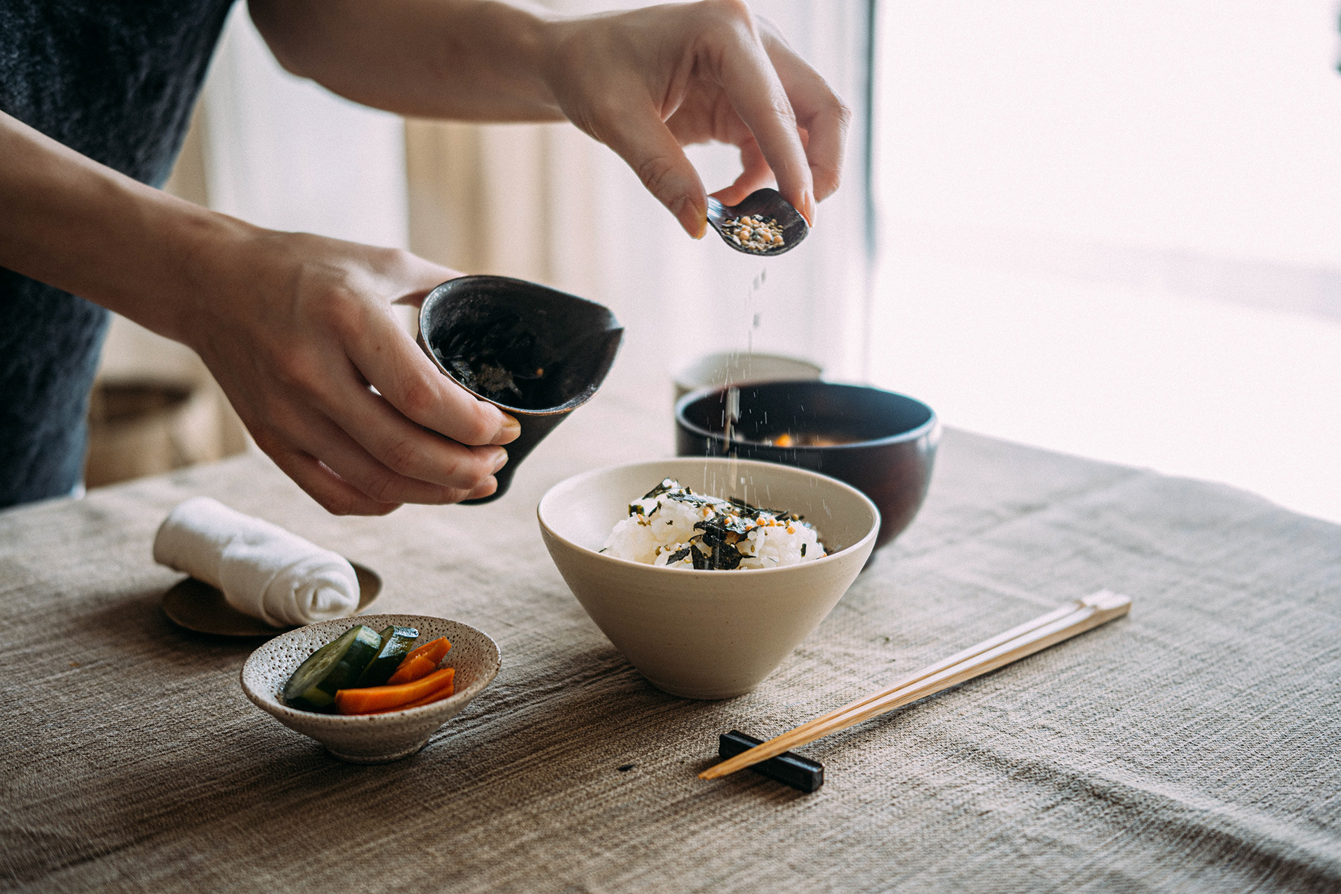 ふりかけを包むタトウ型のパッケージは、正面の半円のくり抜きから中身を覗かせることで、お椀に盛られたふりかけごはんをイメージ。色彩には日本の伝統色を用い、落ち着きと上質さのある和の趣を表現しています。